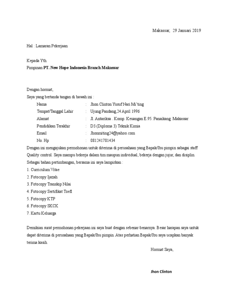 Surat Lamaran Kerja Pt New Hope Doc